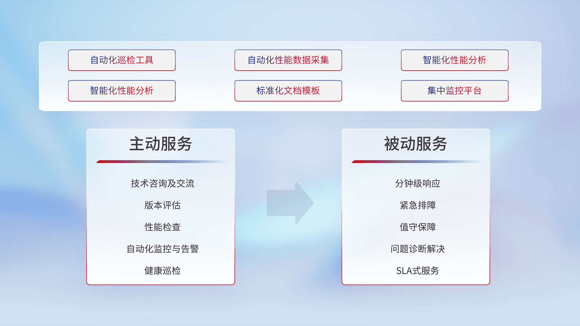 智能化工具和标准化文档,,保障服务质量,,提供主动服务(包含技术咨询、、版本评估、、、性能检查、、、、自动化监控与告警、、、健康巡检)和被动服务包含(分钟级响应、、、、紧急排障、、、、值守保障、、、、问题诊断解决、、SLA服务)。。。
